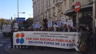 Un centenar de personas se han concentrado a los alrededores del Congreso de los Diputados este mediodía solicitando una escuela pública y laica, donde la Religión no se encuentre dentro del horario lectivo, y también han reclamado la derogación de los acuerdos con la Santa Sede, además de que no se destine dinero público a la enseñanza de la Religión.