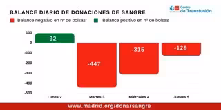 En concreto, el lunes los hospitales madrileños registraron un balance positivo de 92 bolsas de sangre, mientras que la cifra fue cayendo durante el transcurso de la semana con un salgo negativo de 447 el martes, 315 el miércoles y 129 el jueves.