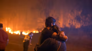 Archivo - Dos personas se abraza en las inmediaciones del incendio, a 5 agosto de 2022, en O Vento, parroquia de Cea, en la comarca de Salnes y el concello de Villagarcía de Arousa, Pontevedra, Galicia (España). - Gustavo de la Paz - Europa Press - Archivo