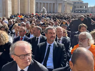 HANDOUT - 26 April 2025, Vatican, Vatican City: Markus Soeder (C), Minister President of Bavaria, attends the funeral mass for the late Pope Francis in St. Peter's Square. The Argentine pontiff, who led the Catholic Church from 2013, died on Easter Monday - Bayerische Staatskanzlei/dpa