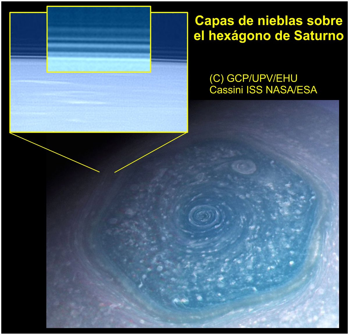 "Las imágenes de Cassini nos han permitido descubrir que, como si formaran un 'sandwich', el hexágono tiene un sistema multicapa de, al menos, siete neblinas que se extienden desde la cima de sus nubes hasta más de 300 km de altura sobre ellas", ha declarado el profesor Agustín Sánchez Lavega, quien lidera el estudio.