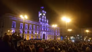 El sonido de las cazuelas y sartenes que portaban las asistentes ha empezado como un leve rumor que ha ido aumentado de volumen según se acercaban las doce de la noche en el reloj de la Real Casa de Correos, iluminado de morado por el Día de la Mujer.