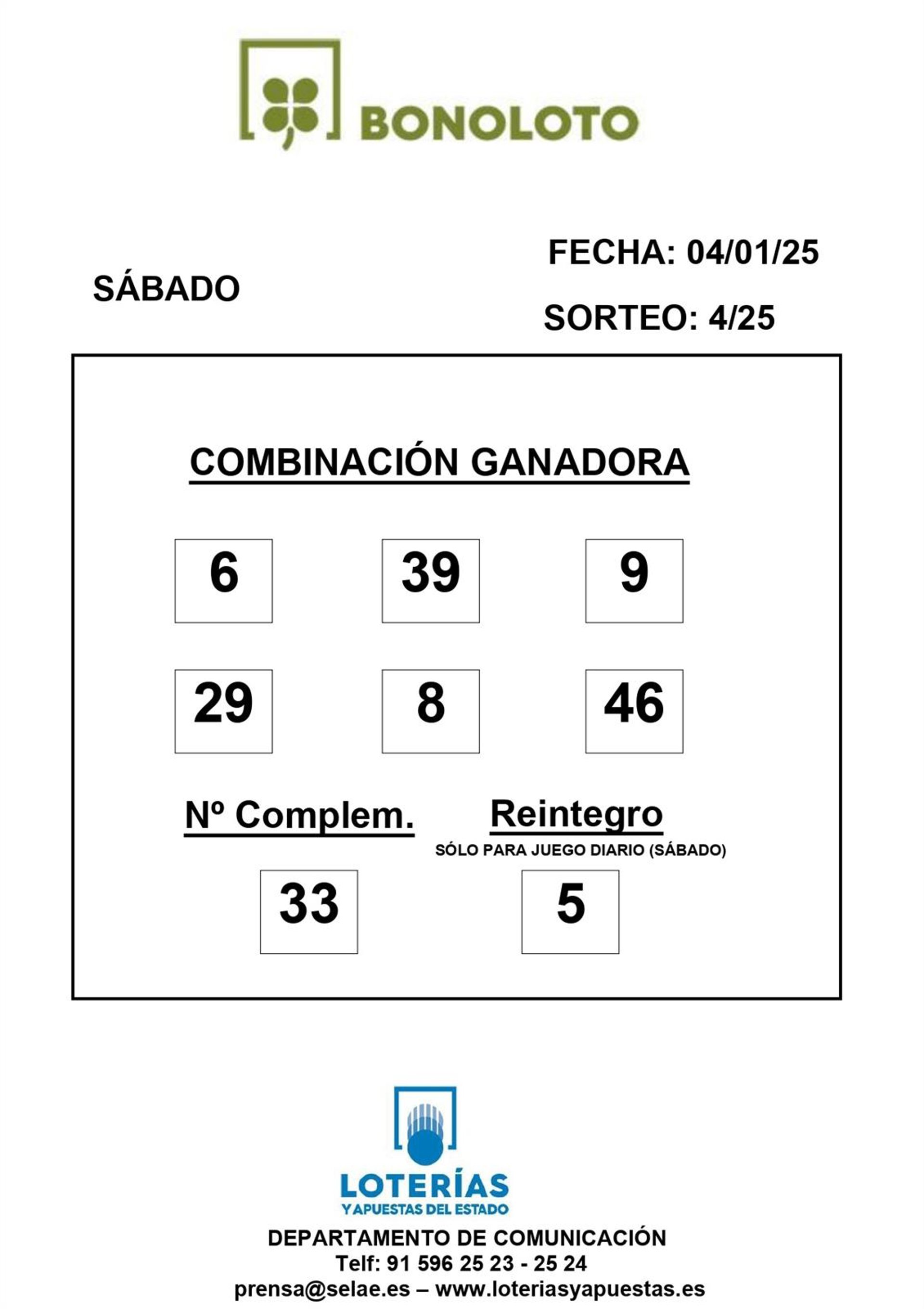 La combinación ganadora del sorteo de la Bonoloto celebrado este sábado, 4 de enero, ha estado formada por los números 6, 39, 9, 29, 8 y 46. El número complementario es el 33 y el reintegro, el 5. La recaudación ha ascendido a 2.252.326 euros.