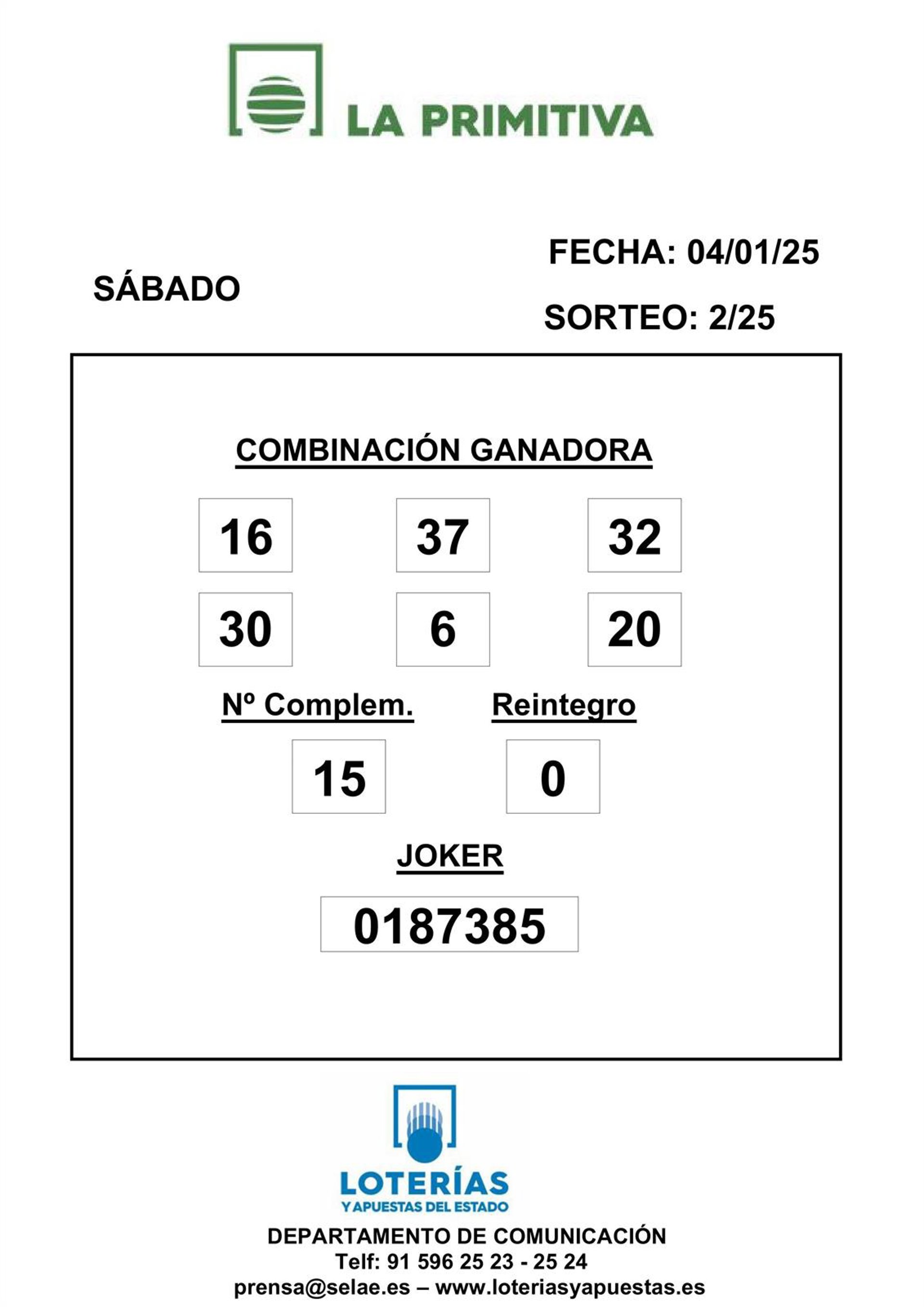 La combinación ganadora del sorteo de 'La Primitiva' celebrado este sábado, 5 de enero, ha estado formada por los números 16, 37, 32, 30, 6 y 20. El número complementario es el 15, el reintegro el 0 y el Joker, el 0187385. La recaudación del sorteo ascendió a 11.442.177 euros.