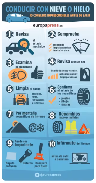 10. Se aconseja informarse del tiempo antes de salir a las carreteras y en caso de que la situación empeore se recomienda parar el coche en zonas de descanso o en alguna población cercana.