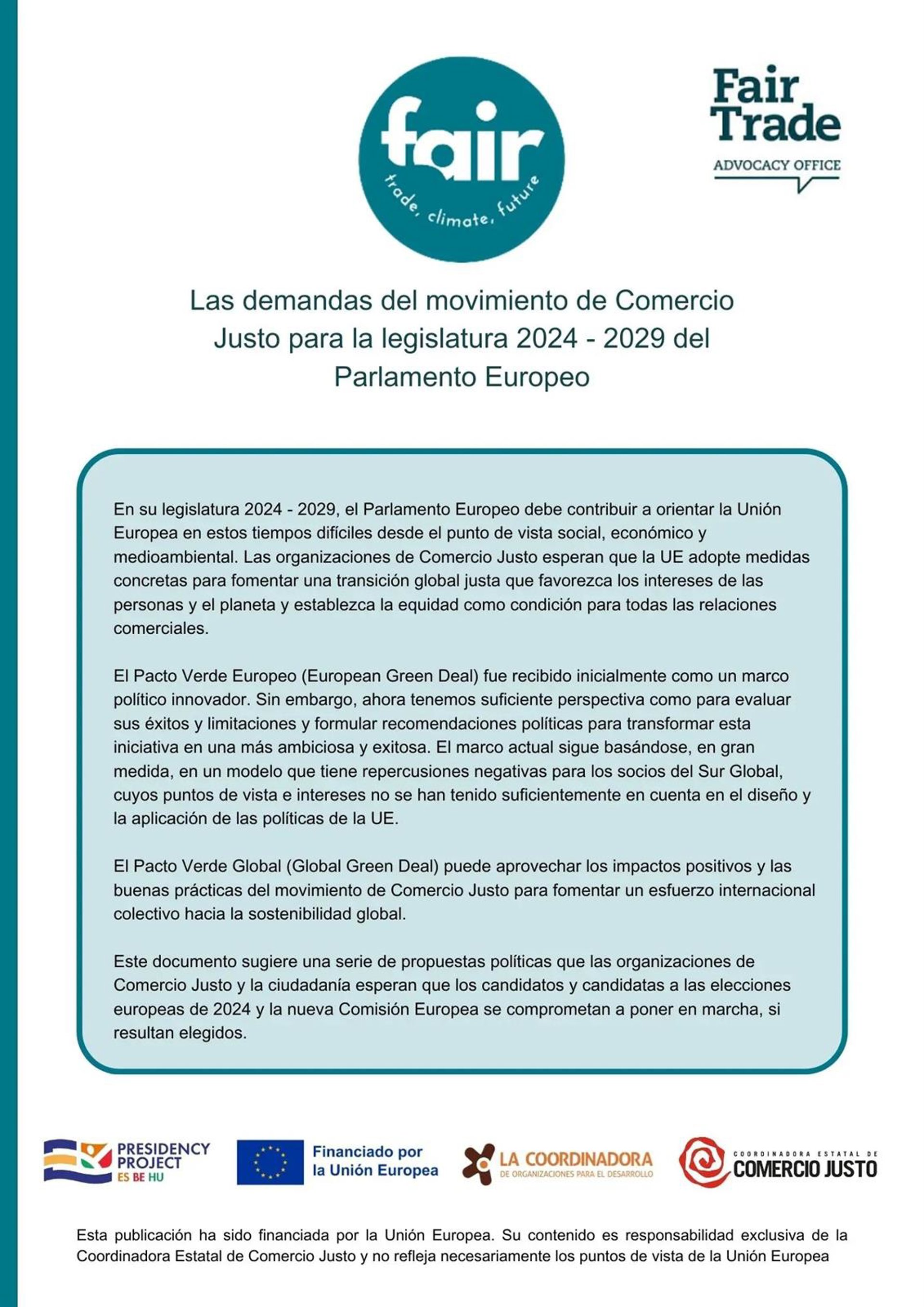 En líneas generales, las organizaciones de Comercio Justo demandan una política comercial justa y sostenible que ponga freno a las crecientes desigualdades económicas y sociales y que combata la emergencia climática. De esta manera, plantean que el nuevo parlamento que surja tras los comicios adopte medidas para fomentar un modelo económico que proteja los derechos humanos y el medio ambiente y establezca la equidad como condición esencial para todas las relaciones comerciales.