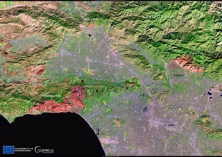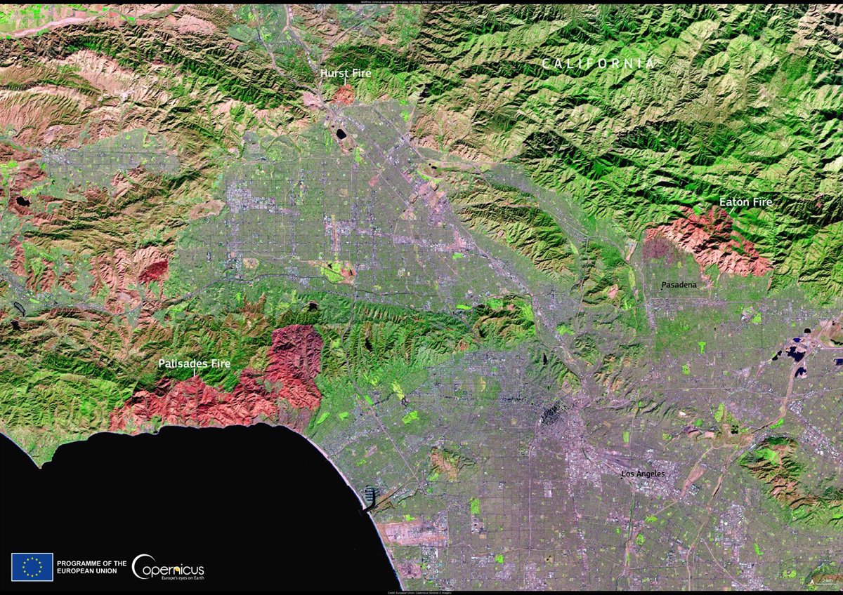 La imagen del Sentinel-2 de Copernicus, tomada este domingo, muestra las marcas de los incendios que afectan a Los Ángeles. Más de 12.000 estructuras han sido destruidas por las llamas, 5.300 sólo en el barrio de Palisades, donde ya han ardido más de 9.000 hectáreas. En la ciudad, 105.000 personas están bajo orden de evacuación y otras 87.000 bajo aviso.