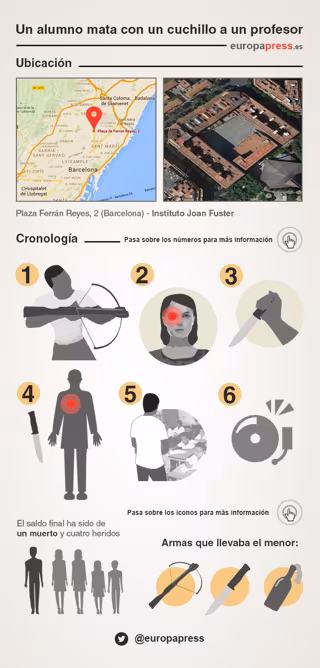 Un alumno de 13 años ha causado la muerte de un profesor este lunes en su instituto de Barcelona, el Joan Fuster del distrito de Sant Andreu. Este es el relato de lo ocurrido según han contado diversas fuentes de la investigación: