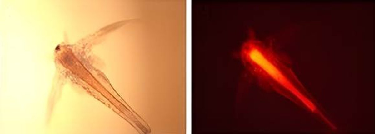Partículas del bioplástico PHBV (en rojo) en el tracto digestivo de A. Franciscana. - IATS-CSIC