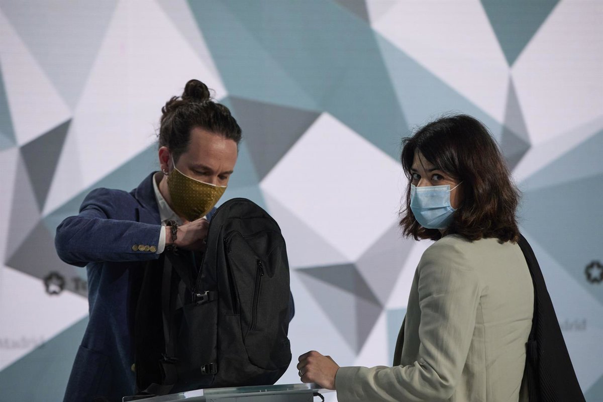 Archivo - La número dos de Podemos en las elecciones a la Comunidad de Madrid, Isa Serra; conversa con el candidato de Unidas Podemos a la Presidencia de la Comunidad de Madrid, Pablo Iglesias, minutos antes del primer debate electoral previo a los comi - EUROPA PRESS/J. Hellín. POOL - Europa Press