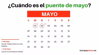 A continuación te dejamos este calendario en el que puedes consultar en qué días cae el puente de mayo este año:
