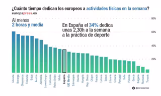 ¿Cuál es el país europeo donde se practica más deporte? ¿Cuánto tiempo dedican los españoles a hacer ejercicio físico? La encuesta realizada por Eurostat, que toma como premisa las dos horas y media semanales de ejercicio físico recomendadas por la Organización Mundial de la Salud (OMS), indica que el 34% de los españoles se sitúa por encima de la media europea a la hora de practicar deporte. Por el contrario, la encuesta también refleja que más de la mitad de los españoles, un 51%, no llevan a cabo ninguna actividad física a la semana.