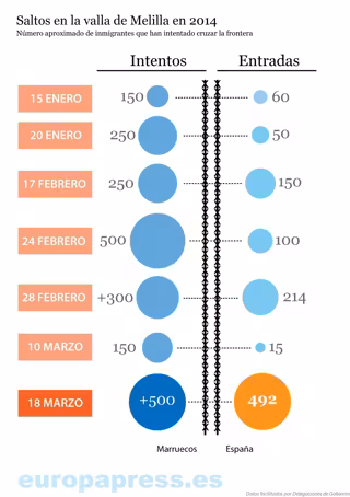 ¿Cuántos intentos de entrada de inmigrantes a Ceuta y Melilla ha habido en 2014?