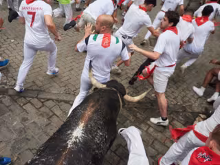Los toros de la ganadería de Victoriano del Río protagonizaron el jueves un cuarto encierro de los Sanfermines vertiginoso y limpio, con alguna caída pero sin momentos de peligro, y en el que la manada corrió agrupada prácticamente toda la carrera.