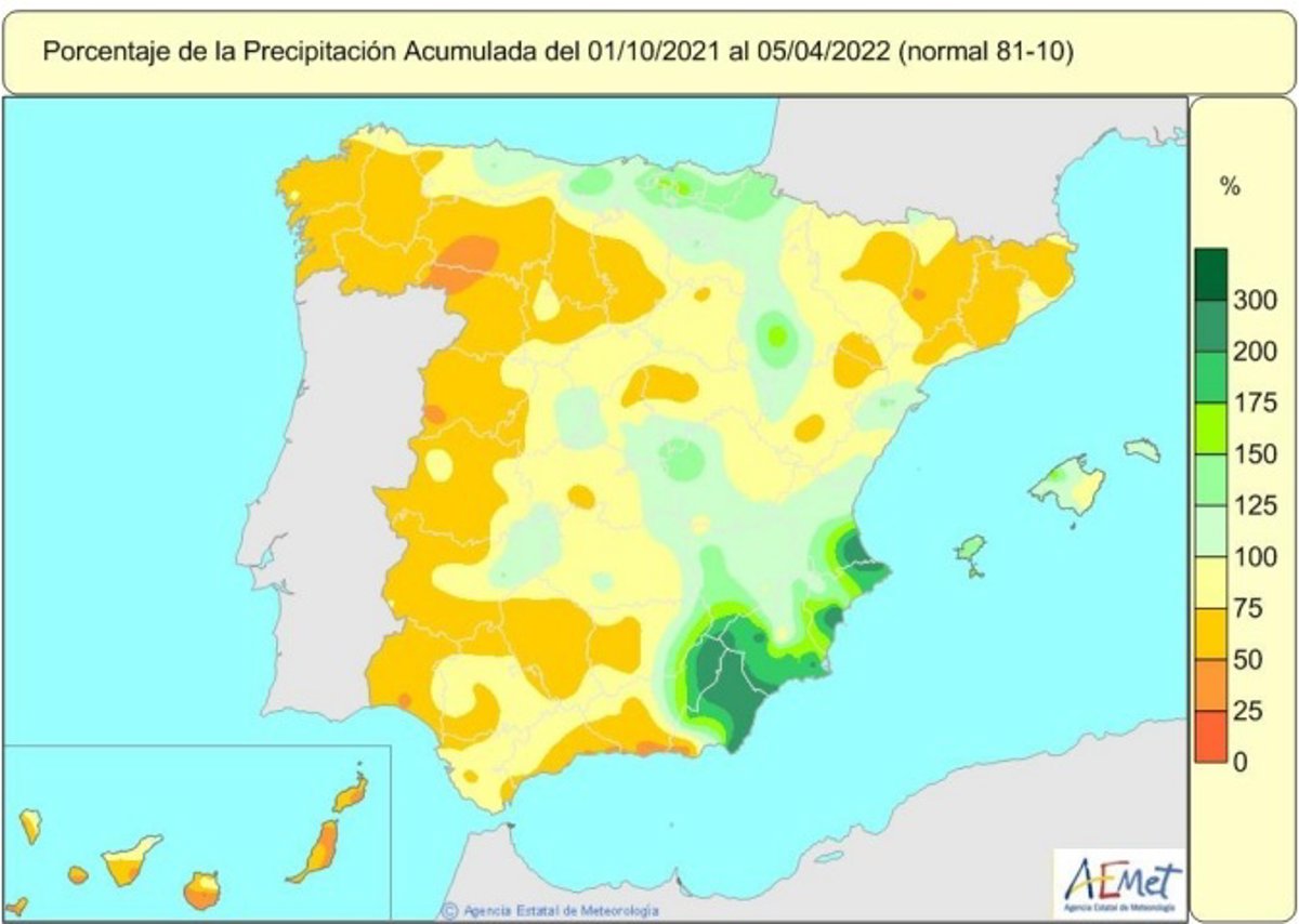 La falta de lluvias acumulada desde que el pasado 1 de octubre comentó el año hidrológico se sitúa en un 23 por ciento por debajo de los valores normales hasta el 5 de abril, ya que ha llovido un valor medio en el conjunto de España de 315 litros por metro cuadrado cuando lo normal para este periodo serían 405 litros por metro cuadrado, según informa la Agencia Estatal de Meteorología (AEMET).