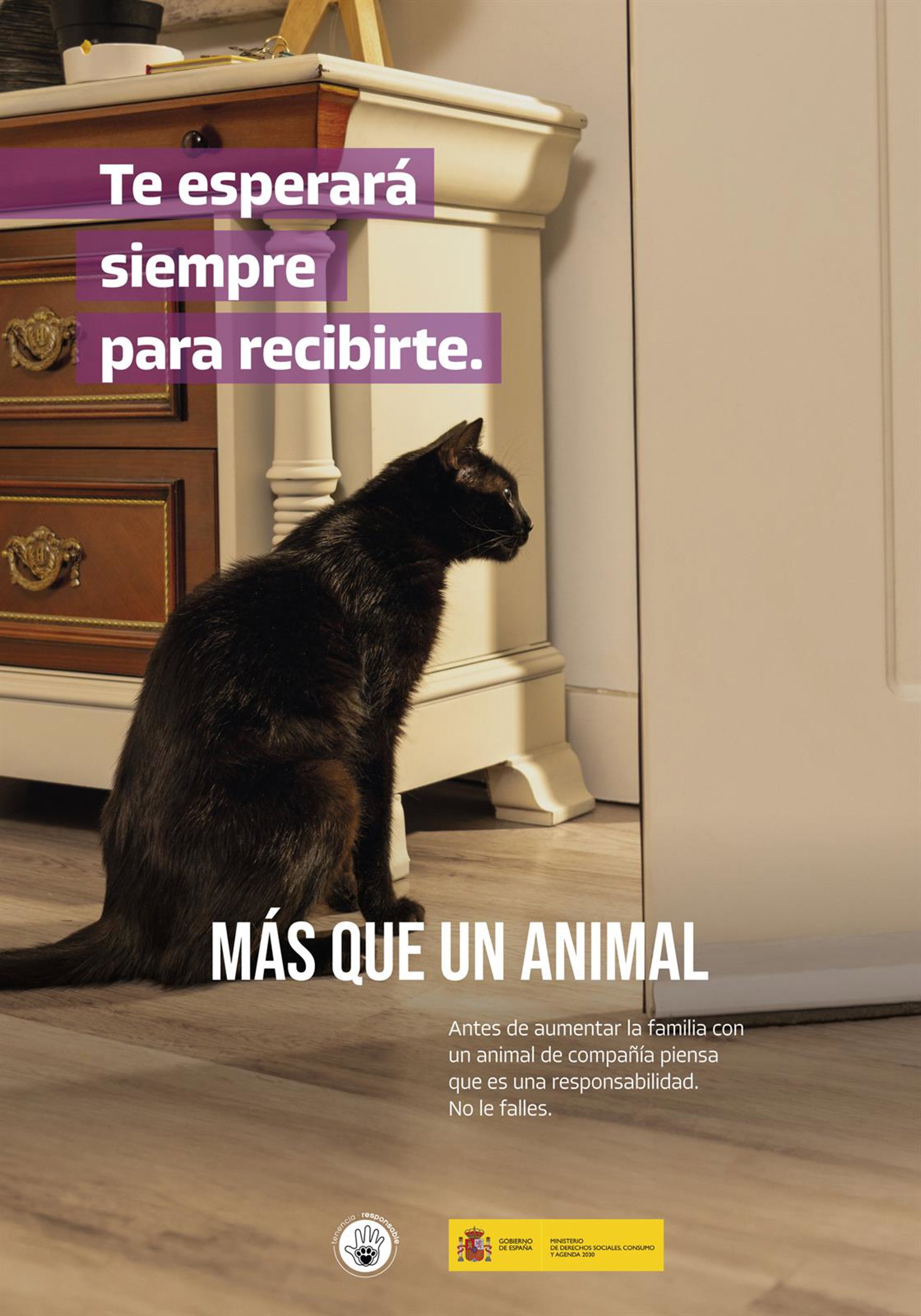 El Ministerio de Derechos Sociales, Consumo y Agenda 2030 ha presentado este lunes su nueva campaña 'Más que un animal' en la que pide reflexionar antes de incorporar a animales a la familia: "Antes de aumentar la familia con un animal, piensa que va a ser tu responsabilidad. No le falles", dice el vídeo de la campaña.