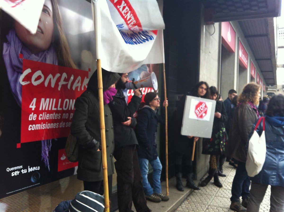 Así, un grupo de integrantes de la plataforma entraron en la sede central del Banco Santander en Santiago con la intención de conseguir por escrito un compromiso de la entidad de que no se iba a desahuciar a cuatro familias de la zona afectadas por ejecuciones hipotecarias.