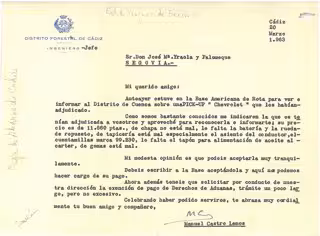 Entre los documentos que se conservan en este caso, se encuentra una carta enviada por Manuel Castro Lemos, el ingeniero jefe del Distrito Forestal de Cádiz, para aconsejar a su homólogo en Segovia, José María Yraola y Palomeque, la adjudicación del camión pick up de 'Ford' que él mismo tuvo oportunidad de ver en la base de Rota.