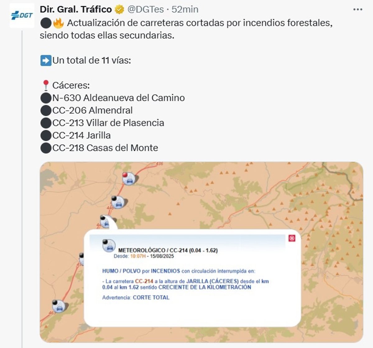 En Cáceres, las carreteras cortadas son la N-630 en Aldeanueva del Camino y en Casar de Cáceres; la CC-321 en Arroyo de la Luz; la CC-318 en Aliseda y la CC-218 en Casas del Monte.