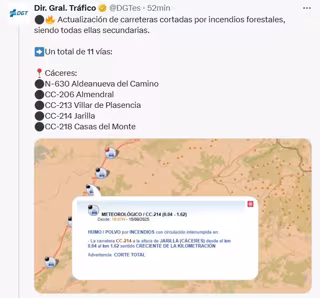 La comunidad autónoma más afectada por los cortes de carretera debido a los incendios es Castilla y León, con un total de seis vías afectadas --una de ellas compartida con Galicia--. Le sigue Extremadura, con cuatro cortes.
