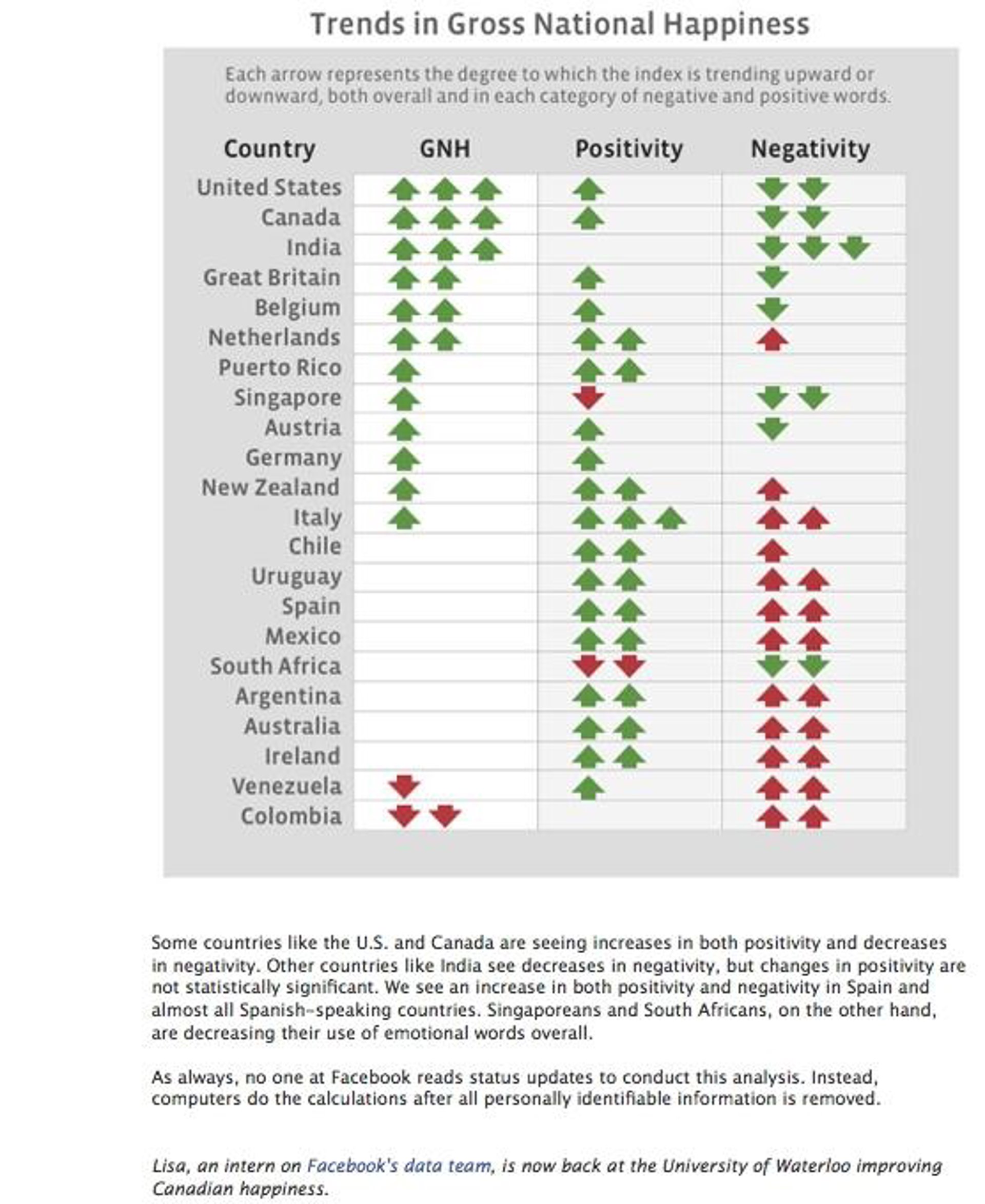 Así por ejemplo se observa que desde septiembre de 2008 algunos países como Estados Unidos y Canadá están experimentando a la vez un incremento en positivismo y descenso en la negatividad. En otros como India hay un descenso de la negatividad, pero los cambios en el positivismo no son estadísticamente relevantes.