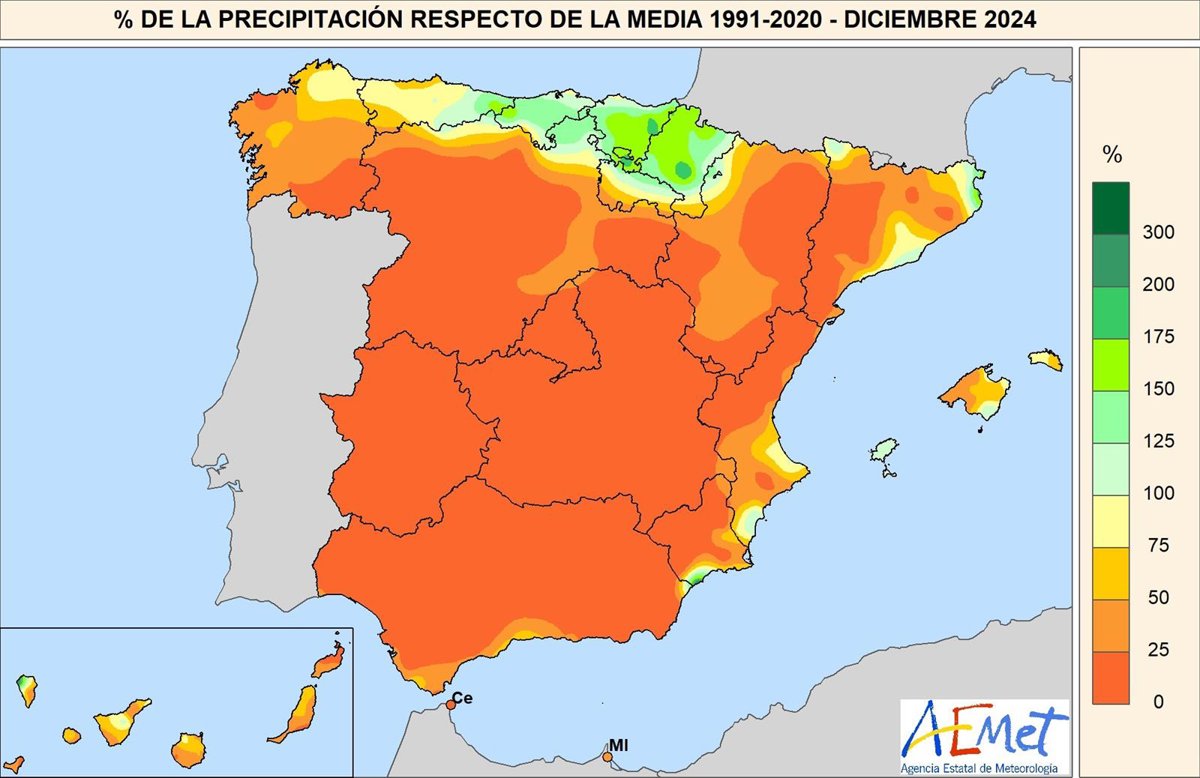 En lo que respecta a las lluvias, en los últimos 24 años sólo diciembre de 2015 registró menos. En la totalidad de la serie, que arranca en 1961, diciembre de 2024 se sitúa como el quinto diciembre más seco.