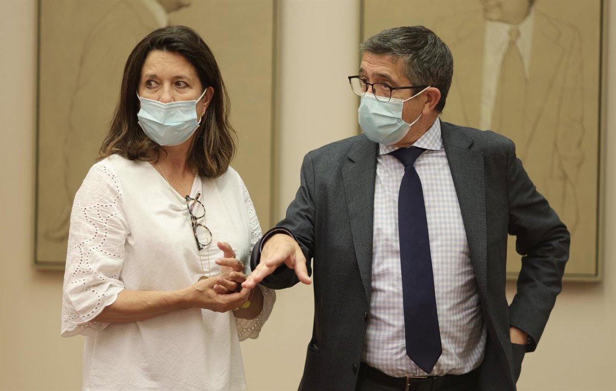 La directora de la Agencia Española de Protección de Datos, Mar España Martí; y el presidente de la Comisión Constitucional, Patxi López, conversan a su llegada a una Comisión Constitucional en el Congreso, a 16 de junio de 2021, en el Congreso de los D - EUROPA PRESS/E. Parra. POOL - Europa Press