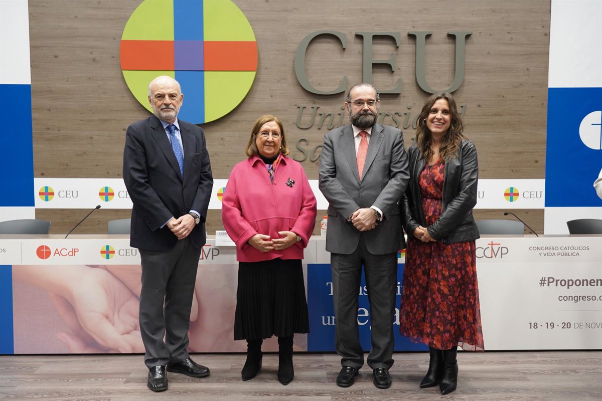 La directora de las Cruzadas de Santa María, Lydia Jiménez, la profesora Lidia Jiménez, el director del Congreso Católicos y Vida Pública, Rafael Sánchez Saus, y el presidente de la ACdP, Alfonso Bullón de Mendoza. - CEU