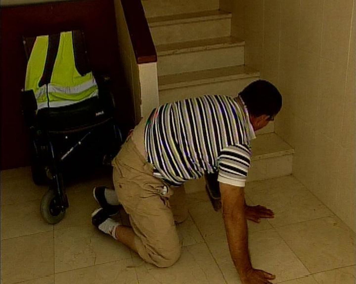 Francisco, o Paco como prefieren que lo llamen, tiene que aparcar la silla de ruedas en el rellano de la escalera para posteriormente tirarse al suelo y sentado, de espaldas, subir poco a poco todos los escalones hasta llegar a su vivienda. La bajada, aseveró, se hace más llevadera aunque en su descenso sigue recibiendo los golpes de cada escalón.