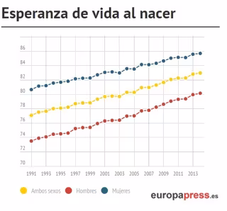 Otra 'buena noticia' es el aumento de la esperanza de vida, que en 2014 marcó un record. Por primera vez en la historia, la esperanza de vida al nacer de los españoles alcanzó los 83 años.