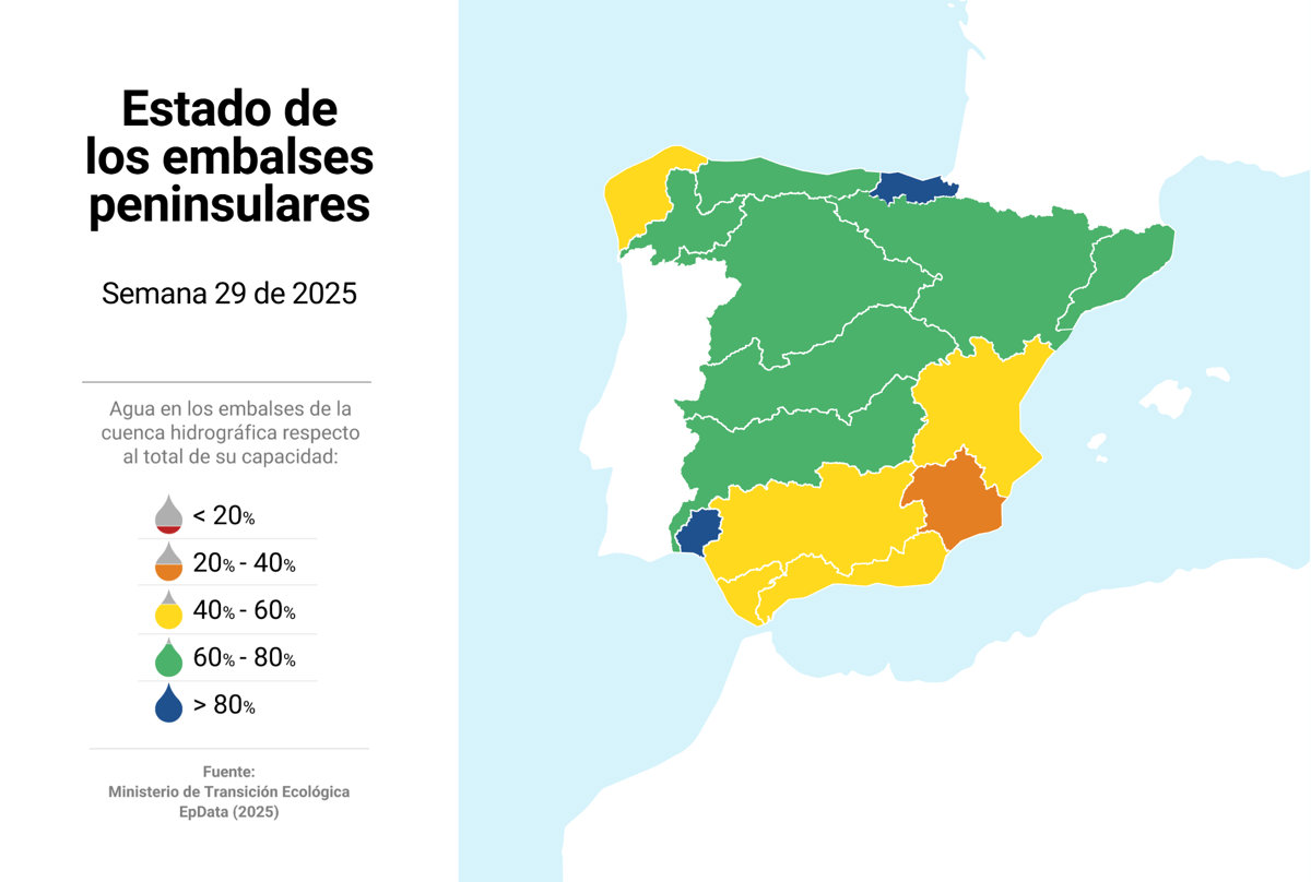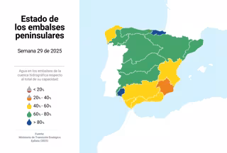 La reserva hídrica almacena 36.852 hectómetros cúbicos (hm3) y está al 65,8% de su capacidad, según datos del Ministerio para la Transición Ecológica y el Reto Demográfico (MITECO) consultados por Europa Press. Aunque los embalses han perdido 693 hm3 en una semana, o lo que es lo mismo, el 1,2% de su capacidad, se encuentran 8,6 puntos por encima que en estas mismas fechas en 2024, cuando la reserva estaba al 57,2%.