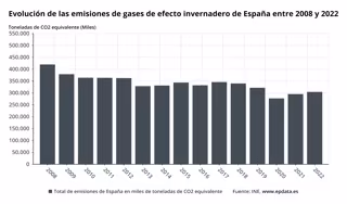 Las emisiones de gases de efecto invernadero (GEI) de la economía española crecieron un 3,1 por ciento en 2022 respecto al año anterior, hasta los 304,4 millones de toneladas de dióxido de carbono equivalente (tCO2eq) de las que el 22,7 por ciento fueron emitidas a la atmósfera por los hogares, según el Instituto Nacional de Estadística (INE).