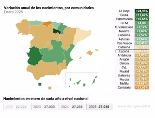 El número de niños nacidos en el mes de enero en toda España ascendió a 27.048, una cifra ligeramente inferior a la del mismo periodo del pasado año (-190 menos). La cifra correspondiente a un mes de enero se mantiene estable en torno a los 27.000 alumbramientos desde 2022, aunque en los últimos cinco años ha caído un 11% y desde octubre de 2021 no se alcanzan los 30.000, según datos del Instituto Nacional de Estadística (INE).