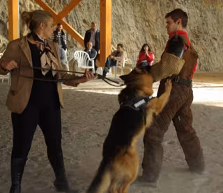 El objetivo es que el perro actúe en caso de que aparezca el maltratador defiendo a la víctima, mediante la inmovilización de su posible atacante.