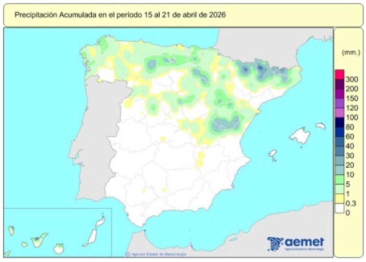 Durante el periodo que va del 15 y el 21 de abril, las precipitaciones afectaron a la mitad norte de la Península y a las islas Canarias más occidentales. En concreto, se sobrepasaron los 10 l/m2 en los Pirineos, así como en puntos más dispersos del norte de Castilla y León, del Sistema Ibérico y del interior de Aragón.