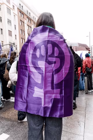 Archivo - Una mujer con una bandera feminista durante una manifestación por el Día Internacional de la Mujer, 8M, a 7 de marzo de 2025, en Madrid (España). - Carlos Luján - Europa Press - Archivo
