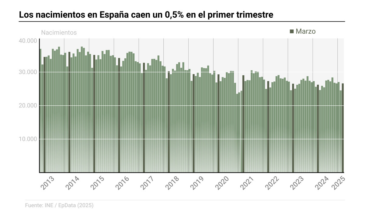 En concreto, hace 10 años, en el primer trimestre de 2015, los nacimientos en España superaban los 100.000. En 2015 nacieron 102.026 niños; 100.875 en los mismos meses de 2016; 95.347 en 2017; 90.323 en 2018; 87.963 en 2019; 86.708 en 2020; 77.335 en 2021; 79.966 en 2022; 77.787 en 2023; 78.433 en 2024 y 78.014 en 2025.