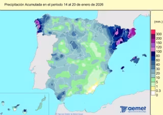 Por el contrario, se mantienen por debajo de los valores normales en el interior de Mallorca y en el sur de La Palma, Tenerife y Gran Canaria. Durante el periodo del 14 al 20 de enero, el organismo estatal ha indicado que las precipitaciones fueron generalizadas y afectaron a todo el territorio salvo a la mitad sur de la provincia de Almería y al sur de la Palma, Tenerife y Gran Canaria.