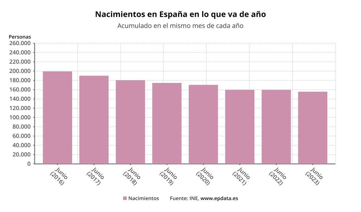 España ha registrado 26.513 nacimientos el pasado mes de junio por lo que el número de nacimientos en el primer semestre del año asciende a 155.629, un 2,51% menos en comparación con el mismo periodo de 2022, según las estimaciones de nacimientos mensuales del Instituto Nacional de Estadística (INE) correspondiente a junio de 2023.