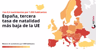 La población española siguió creciendo en el último año, en gran medida gracias al efecto de la inmigración, pero España registró la tercera tasa de natalidad más baja de la Unión Europea con 8,4 nacimientos por cada 1.000 habitantes, la misma cifra que Portugal y tan solo por detrás de Italia (7,6) y Grecia (8,2), según datos de la oficina estadística europea, Eurostat.