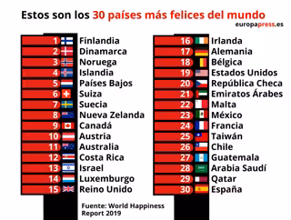 Según el citado informe, elaborado en base a tres años de encuestas sobre cómo se sienten los ciudadanos felices, ha revelado que los vecinos nórdicos Dinamarca, Noruega e Islandia siguen de cerca a Finlandia en la clasificación. El ranking de los 10 países más felices se completa con Holanda, Suiza, Suecia, Nueva Zelanda, Canadá y Austria. Estados Unidos ocupa el puesto 19, Rusia 68, China 93 y India 140.