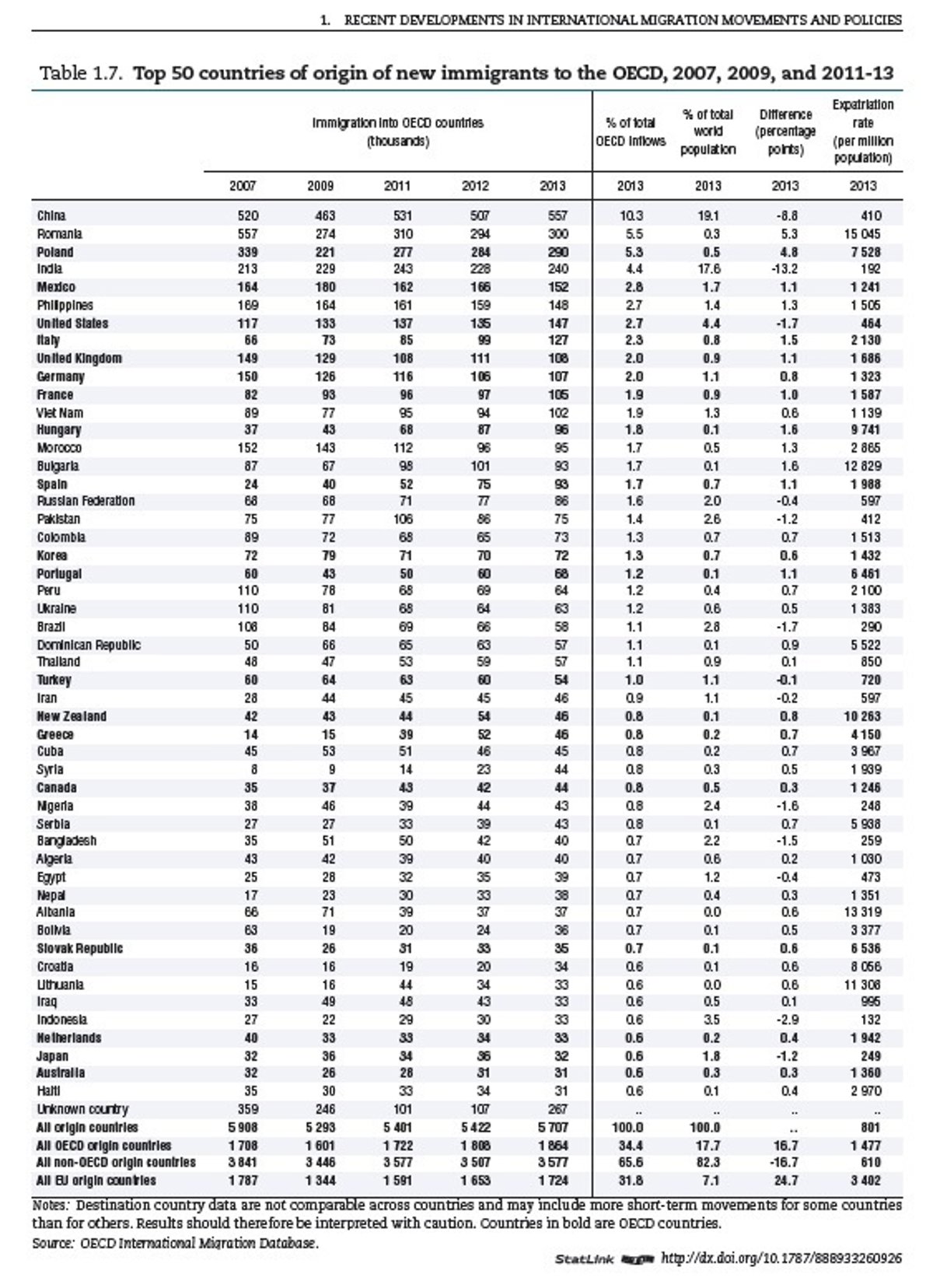Por países, China encabeza la clasificación de emisores de emigrantes, con 557.000 personas que se dirigieron a otros países de la OCDE en 2013. Le siguen Rumanía, con 300.000; Polonia, de donde salieron 290.000 personas; India, con 213.000 emigrantes; México, con 240.000; Filipinas, que dejó 152.000 emigrantes y Estados Unidos, de donde procedían 148.000 personas a otros lugares de la OCDE.