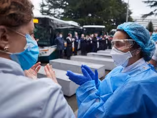 Varios sanitarios agradecen los aplausos durante el homenaje recibido por los trabajadores del transporte público en el Hospital de Navarra . - Eduardo Sanz / Europa Press