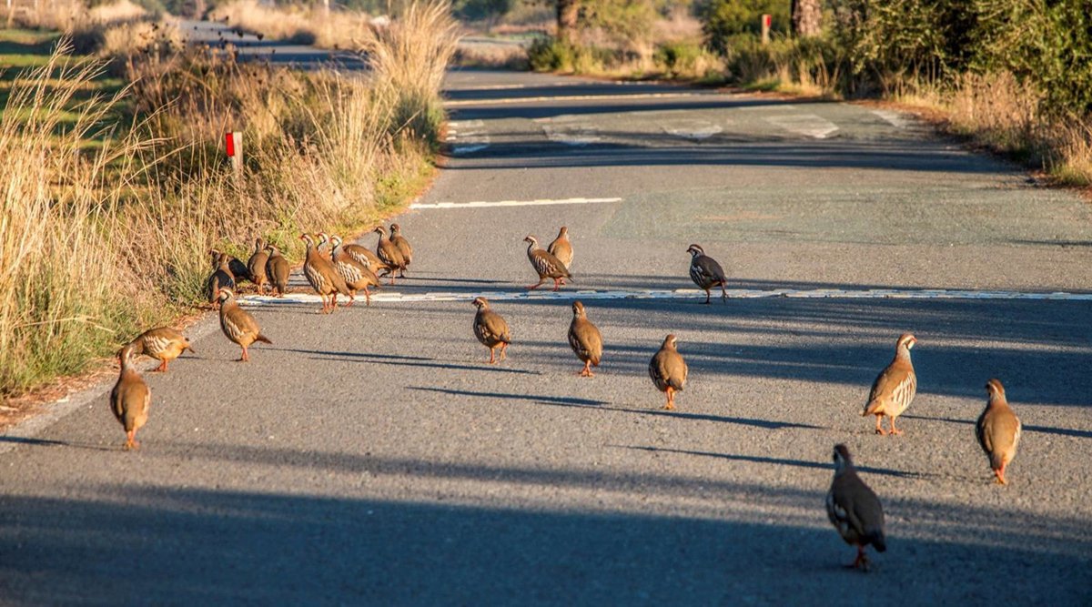 Grupo de perdices rojas en una carretera en Aznalcázar, en la provincia de Sevilla. - JACINTO ROMÁN