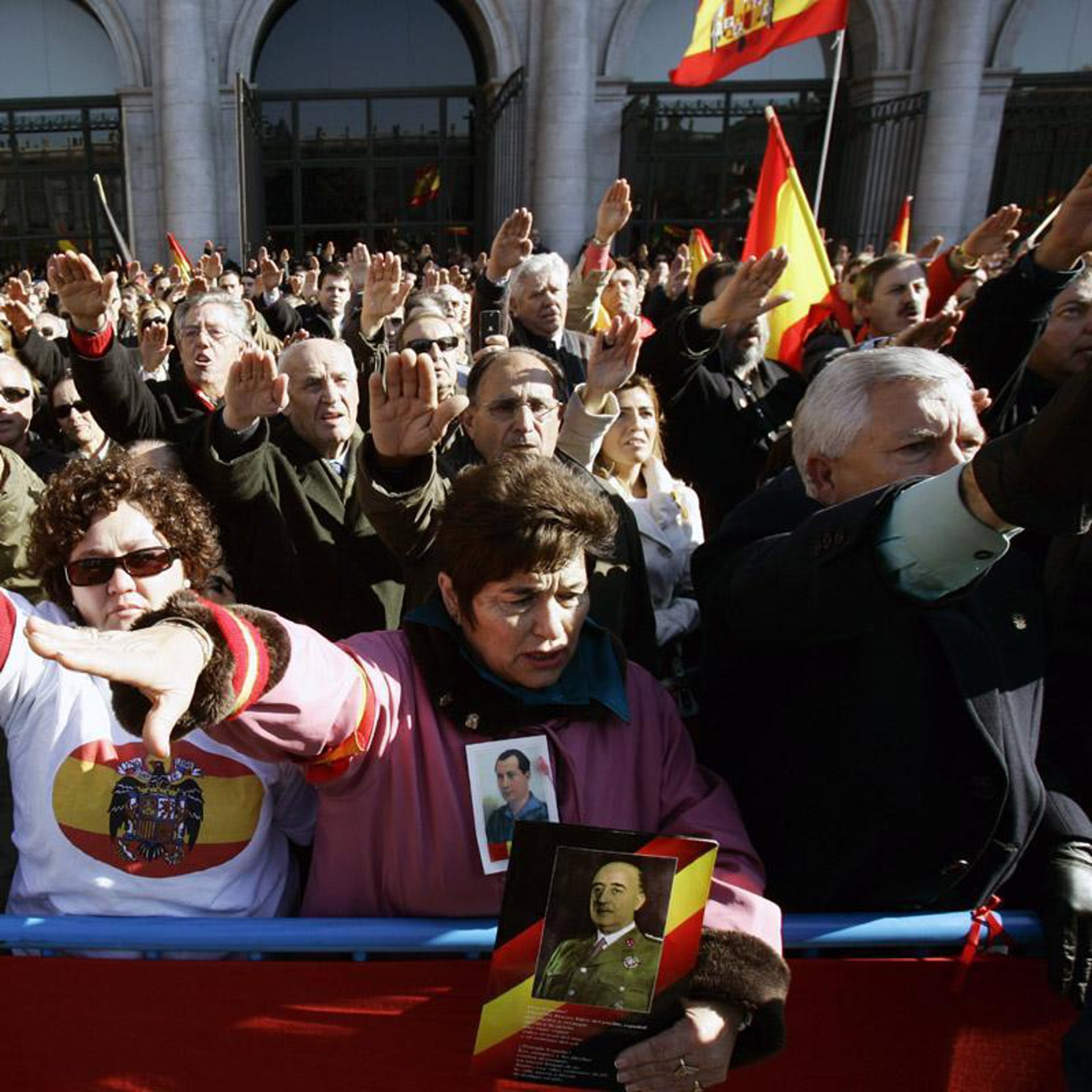 Grupos de falangistas se reunieron hoy en la plaza de Oriente de Madrid para homenajear a Francisco Franco y al fundador de la Falange Española, José Antonio Primo de Rivera, en un acto en el que mostraron su rechazo a la Ley de Memoria Histórica.