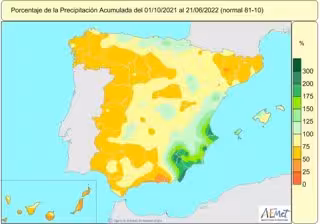 La mayor parte de España ha recibido menos lluvias de lo normal en lo transcurrido del año hidrológico hasta el 21 de junio, según la AEMET, que cifra el déficit hídrico medio del conjunto de España en el 26% - AEMET