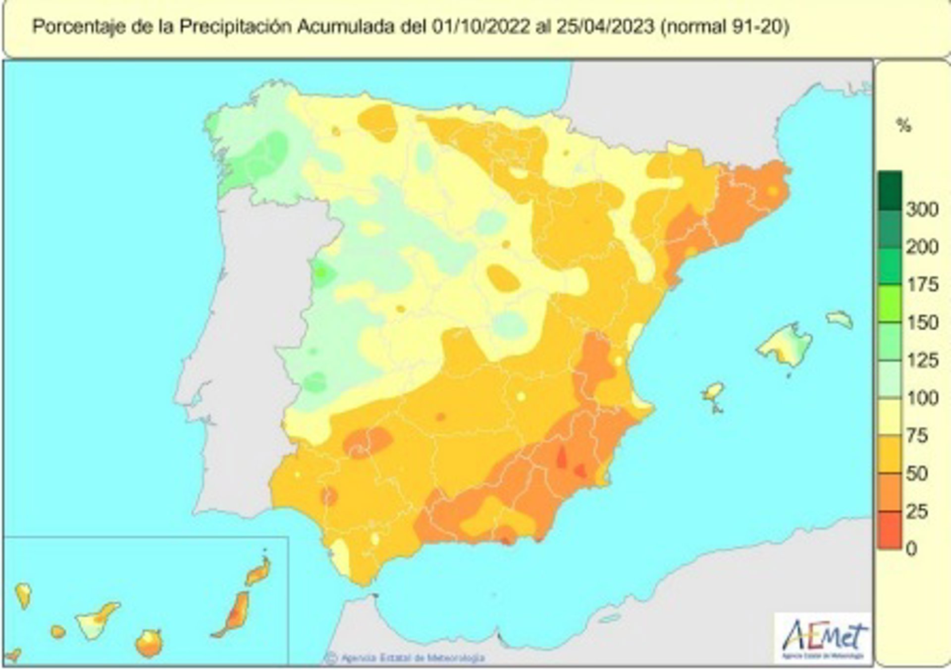 La falta de lluvias acumulada en el conjunto de España crece hasta el 24 por ciento desde el 1 de octubre de 2022 al 25 de abril de 2023. - AEMET