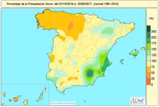 La falta de lluvias acumulada desde que comenzó el pasado 1 de octubre de 2016 hasta el 20 de junio se sitúa en el 13 por ciento por debajo de los niveles normales para el conjunto de España, ya que ha llovido 477 litros por metro cuadrado, lo que representa en torno a un 13 por ciento menos de los 548 litros por metro cuadrado que sería el valor normal.