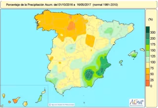 Las lluvias acumuladas desde que comenzó el año hidrológico, el pasado 1 de octubre de 2016, se sitúan en un 12 por ciento por debajo del nivel normal, ya que ha llovido hasta el 16 de mayo un total de 440 litros por metro cuadrado, frente a los 498 litros por metro cuadrado que serían el valor medio para el conjunto de España.