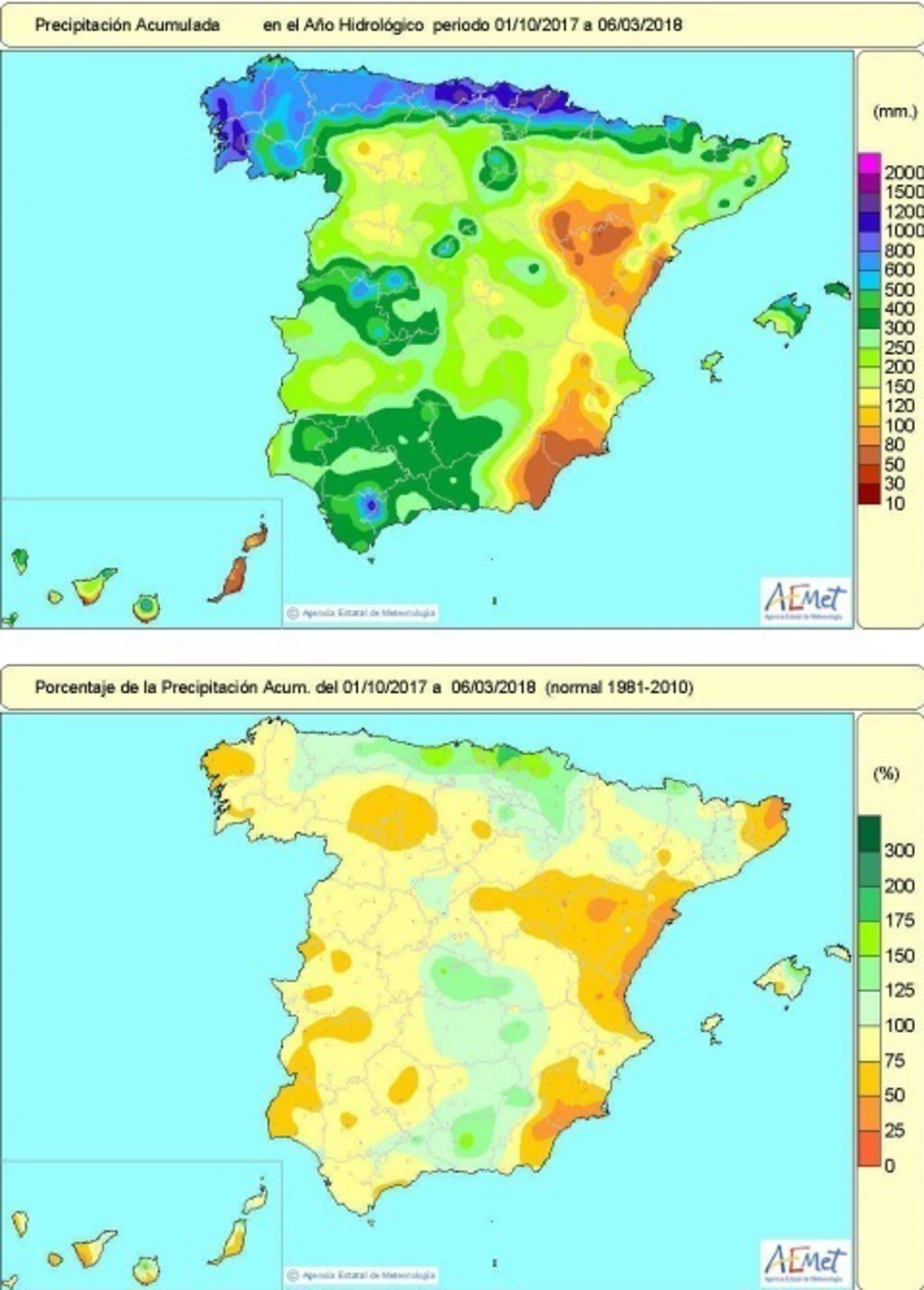 Así, la AEMET señala que el valor medio de las precipitaciones acumuladas desde el 1 de octubre de 2017 hasta el 27 de febrero de 2018 alcanzaba 250 litros por metro cuadrado, cuando lo normal en ese periodo son 352 litros por metro cuadrado.